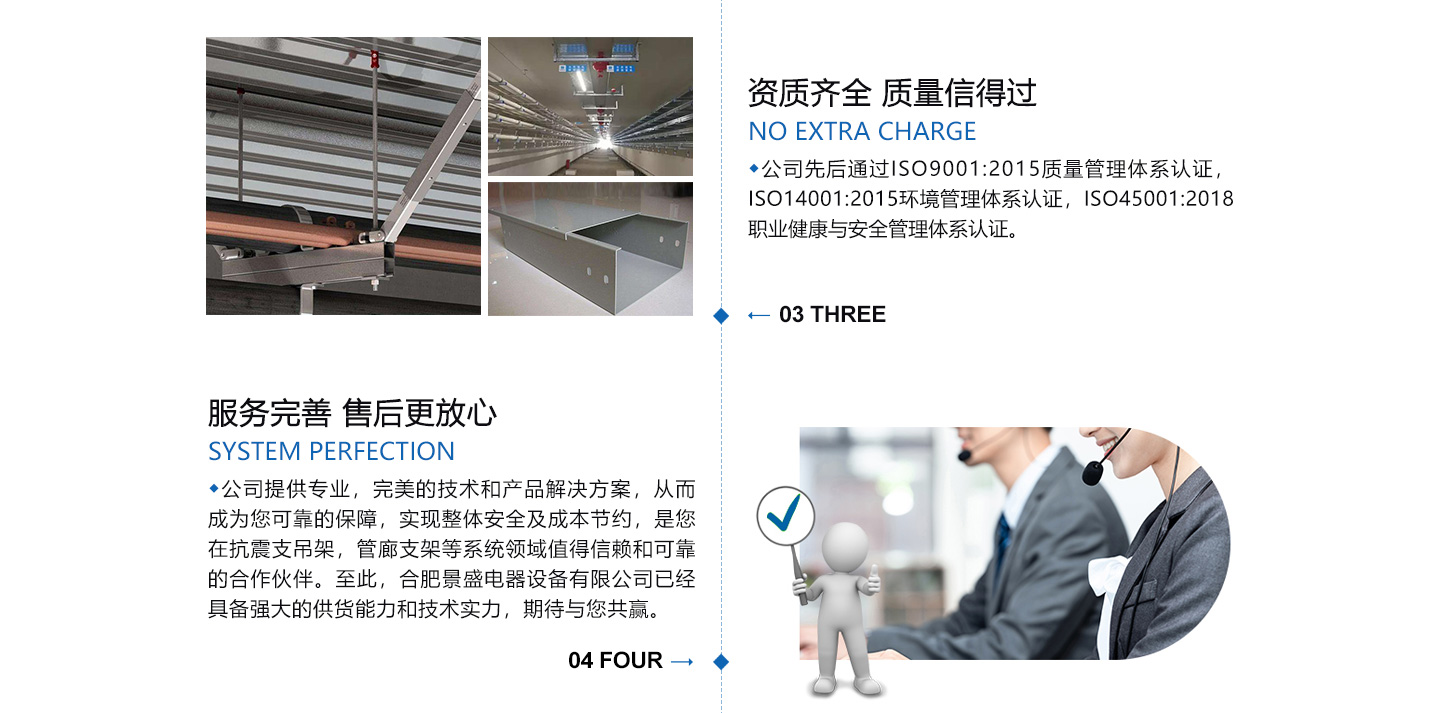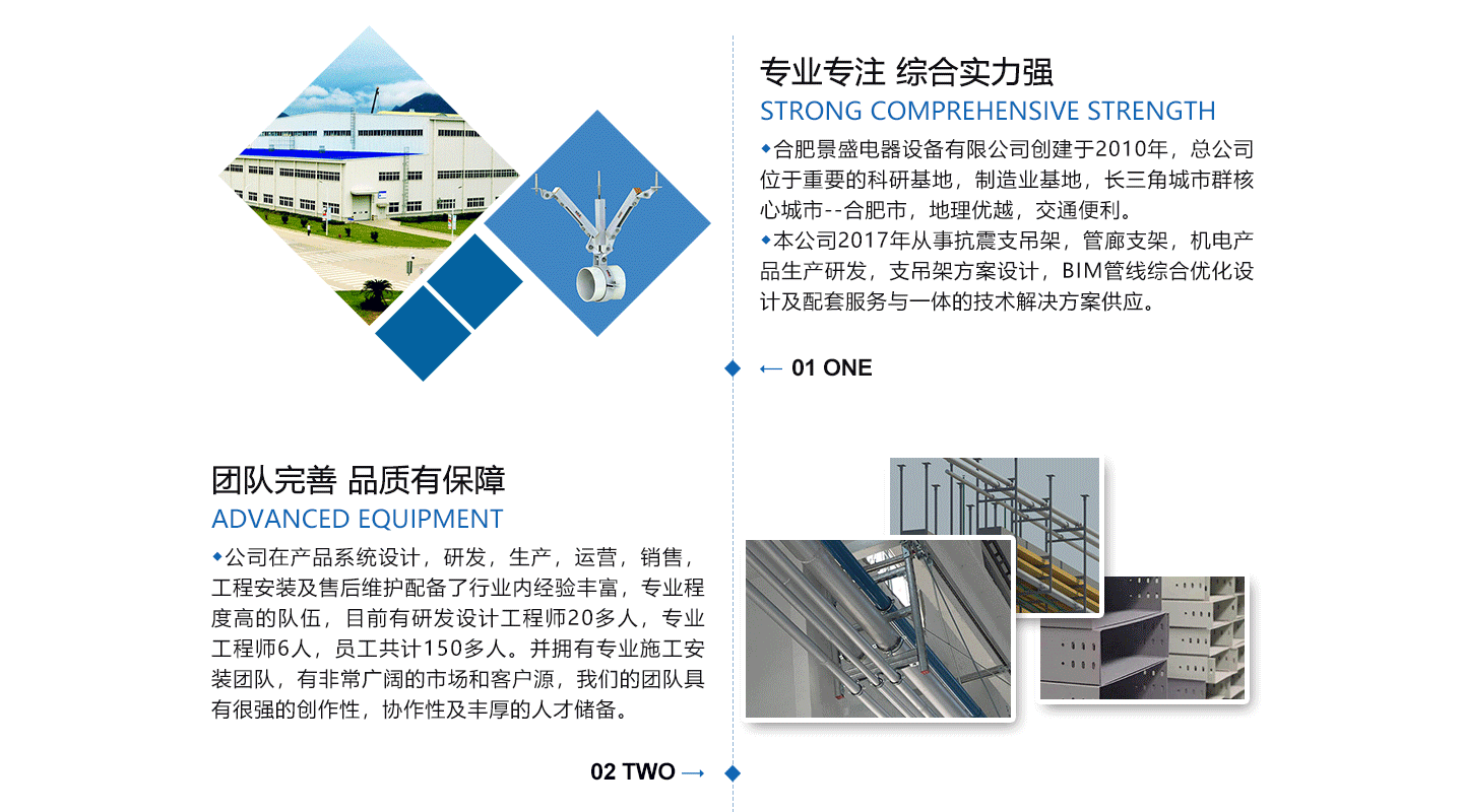 合肥景盛電器設備有限公司創(chuàng)建于2011年,注冊資本3000萬,總公司位于中國重要的科研基地,制造業(yè)基地,長三角城市群中心城市-----合肥市,地理位置好,交通方便。本公司2017年從事抗震支吊架,電纜橋架,機電產品生產研發(fā),支吊架方案設計,BIM管線綜合優(yōu)化設計及配套服務與一體的技術解決方案供應。公司在產品系統設計,研發(fā),生產,運營,銷售,工程安裝及售后維護配備了行業(yè)內經驗豐富,服務程度高的隊伍,目前有研發(fā)設計工程師20多人,工程師6人,員工共計150多人。并擁有施工安裝團隊,有非常廣闊的市場和客戶源,我們的團隊具有很強的創(chuàng)作性,協作性及豐厚的人才儲備。 公司先后通過ISO9001:2015質量管理體系認證...